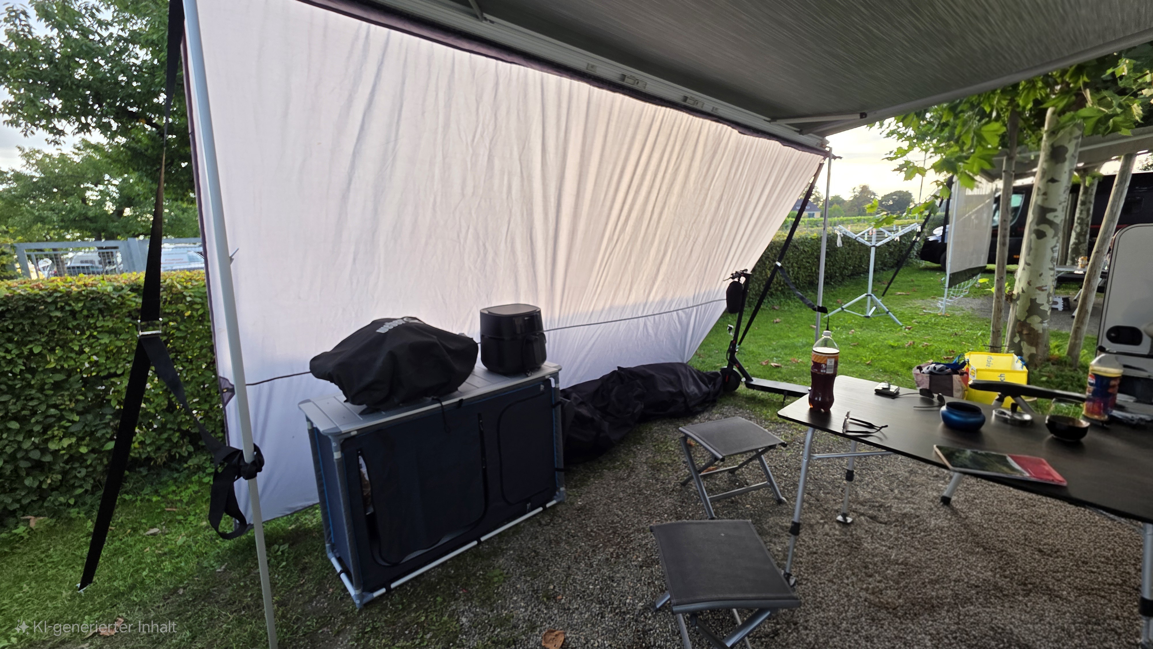 Borsa per il trasporto, Ventilazione permanente nella parte posteriore, Gambe regolabili, Schermo antivento, Spazio per la bombola, Lavandino, Ripiano arrotolabile