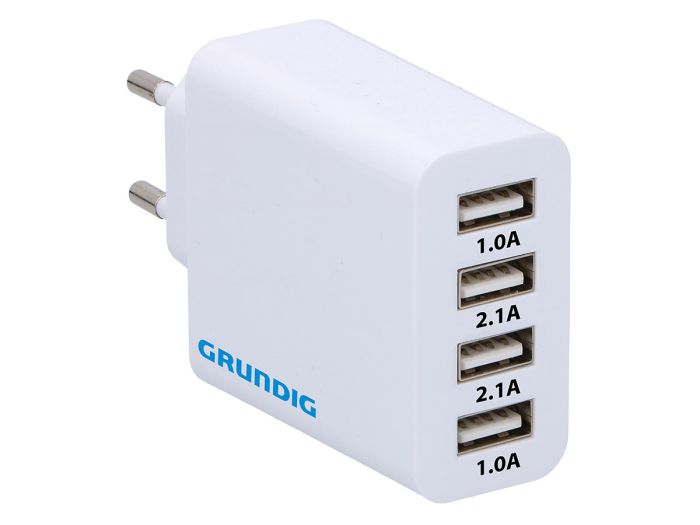 Questo caricatore USB della Grundig permette di ricaricare facilmente lo smartphone o il tablet. Grazie alle 4 porte di cui è dotato permette di caricare contemporaneamente fino a 4 dispositivi.
