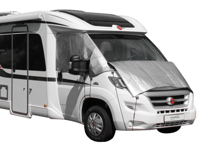 La copertura isolante da esterno per camper della Hindermann è concepita per il parabrezza anteriore e i due finestrini laterali ed è adatta per tutte le stagioni.