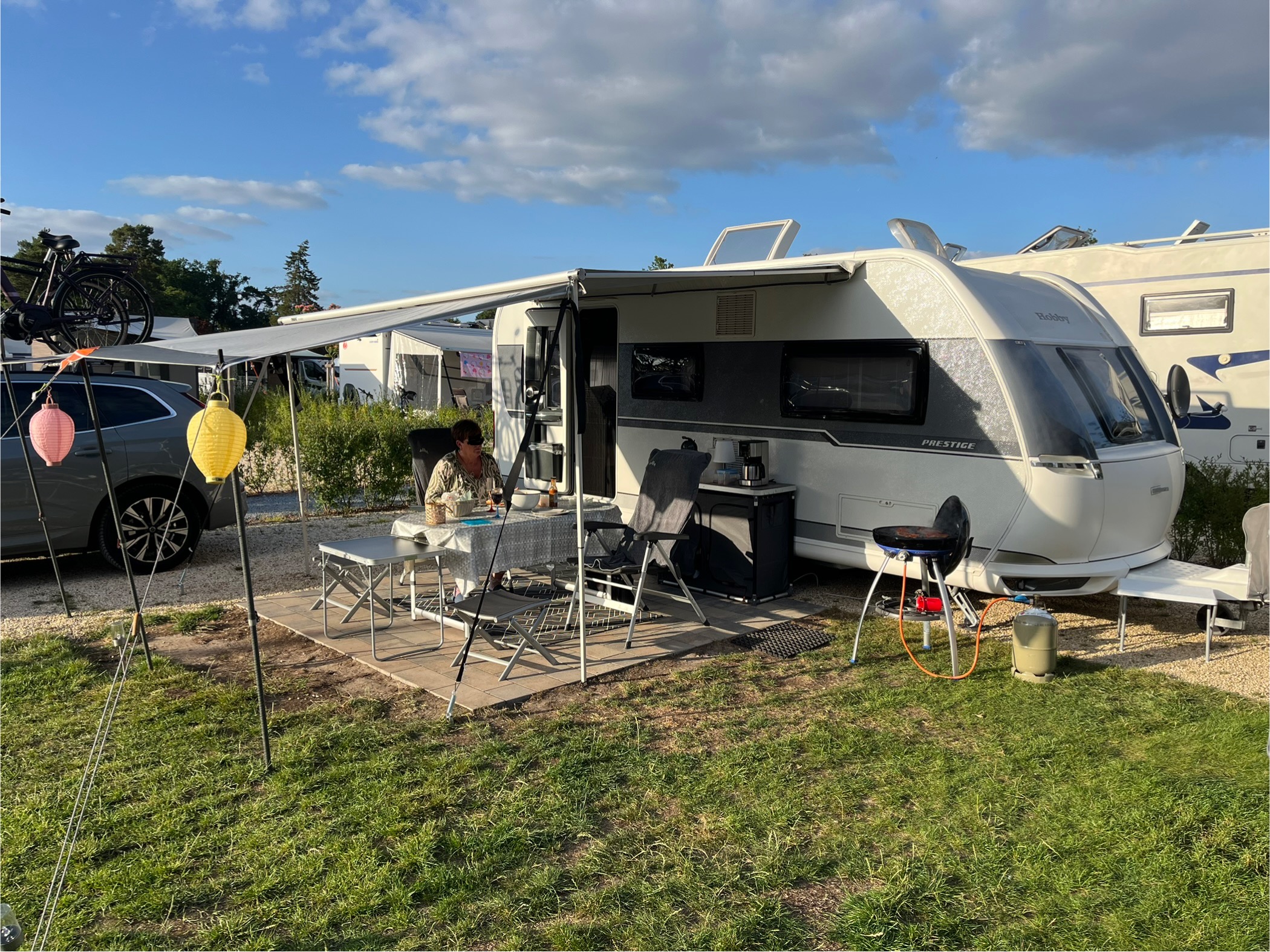 Un caravan aerodinamico è un caravan con la parte anteriore inclinata.