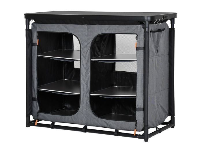 La parte posteriore è dotata di rete che garantisce una buona ventilazione interna. Su un lato sono presenti due piccole tasche portaoggetti, ideali ad esempio per riporre le creme solari. Entrambi i lati sono inoltre dotati di tre ganci, perfetti per appendere asciugamani o strofinacci. Il Avignon Alu è perfetto per preparare i pasti, lavare le stoviglie e tenere tutto il necessario per cucinare ben organizzato.