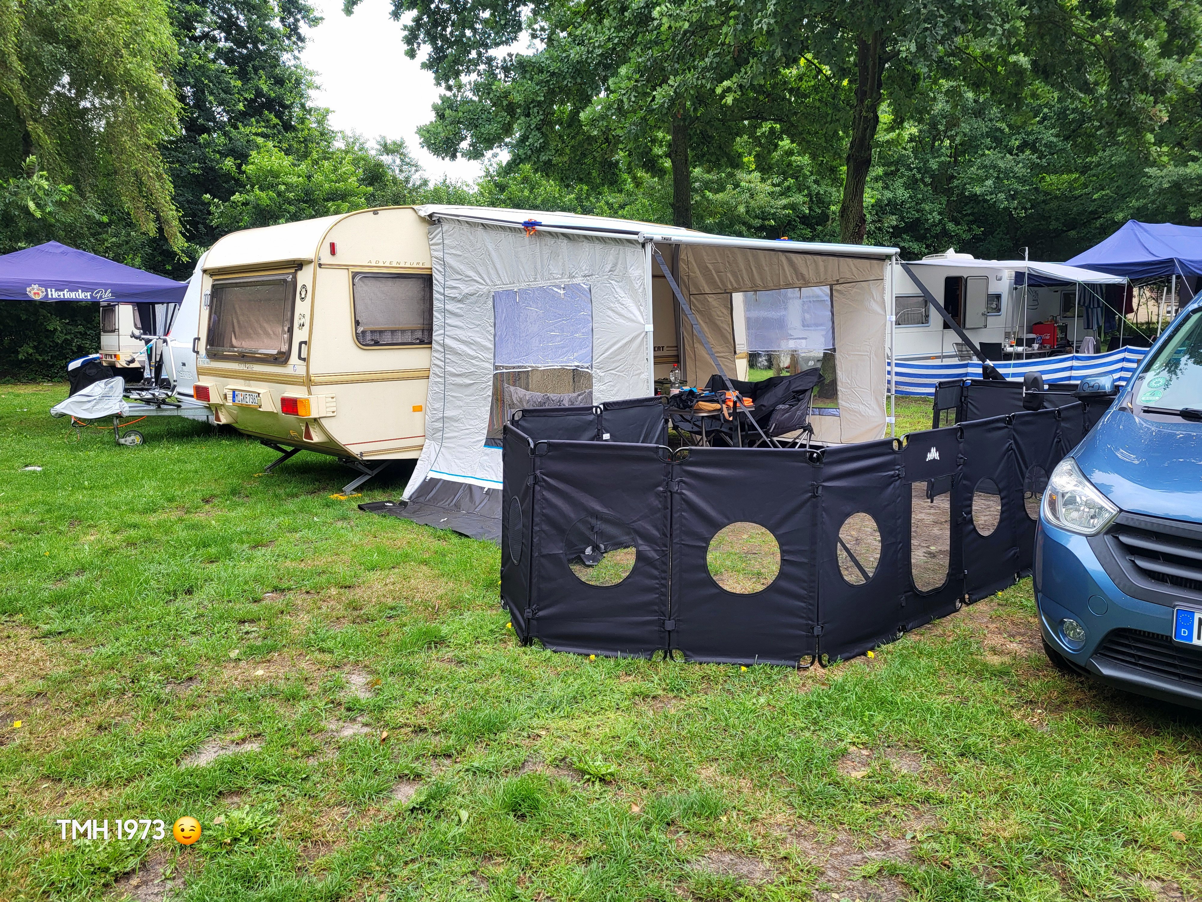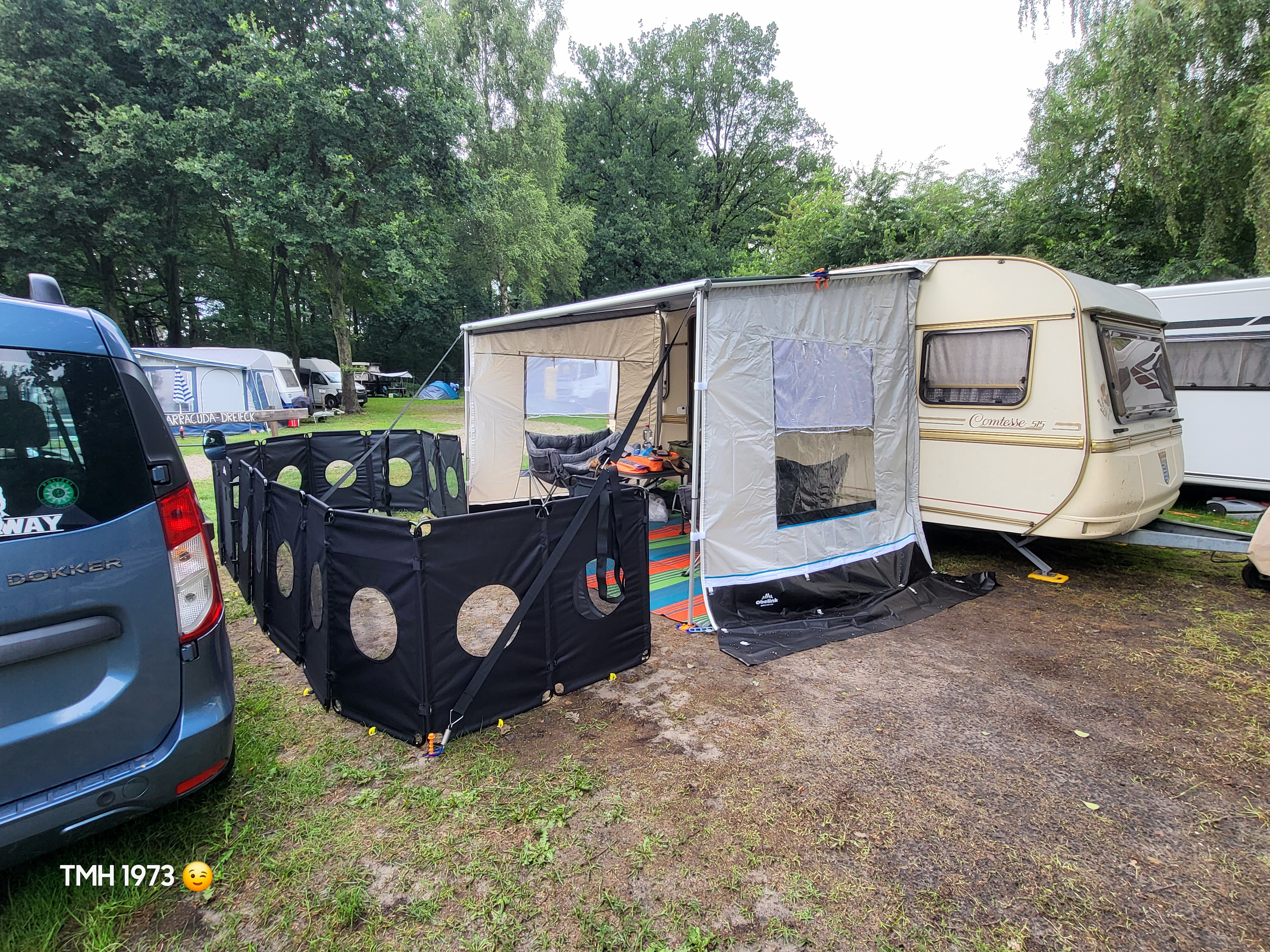 Il recinto può essere ampliato con due pannelli laterali acquistabili separatamente per creare ancora più spazio di movimento. L'immagine con il recinto davanti alla roulotte mostra il recinto con il set di estensione.