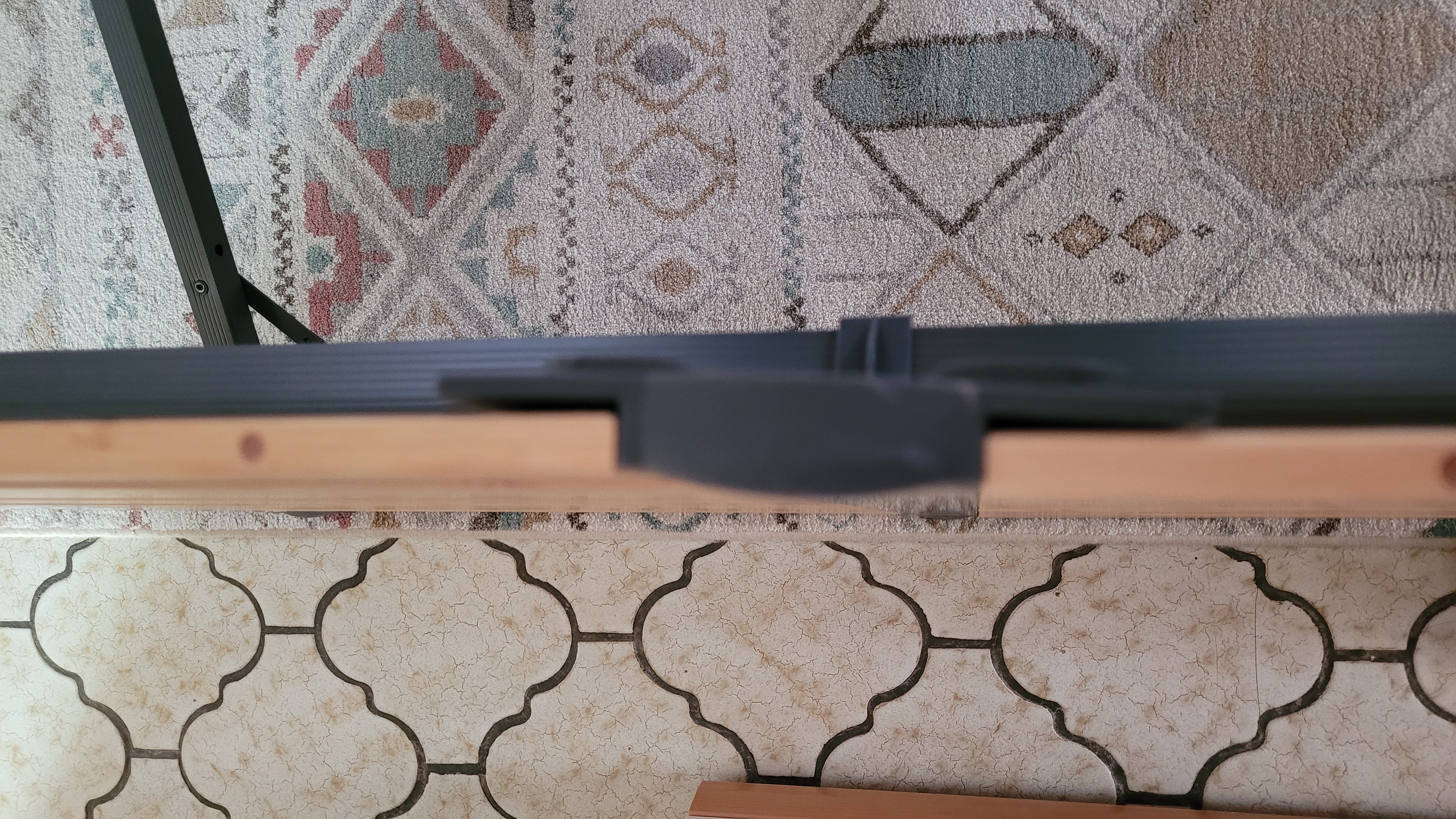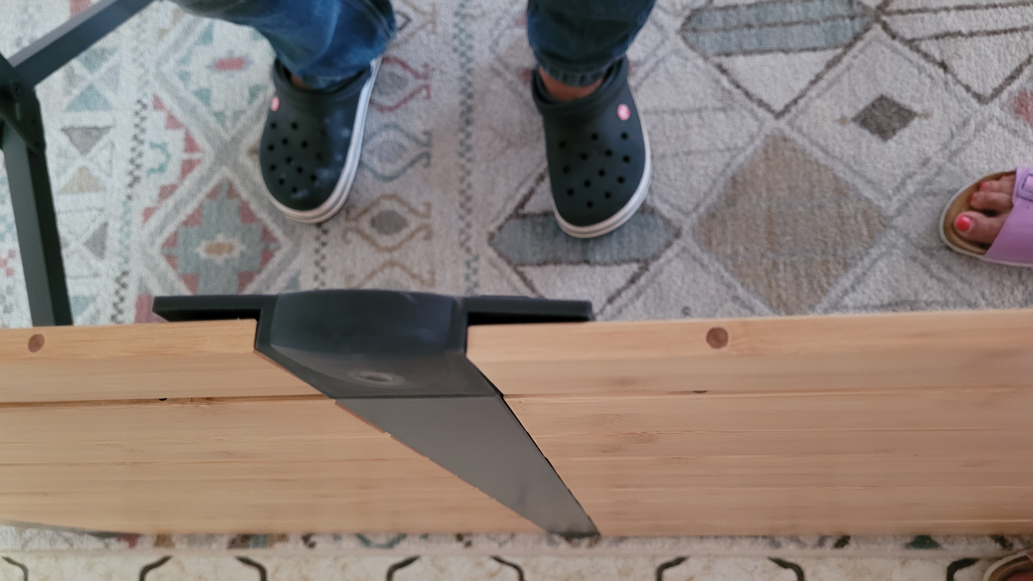 Il telaio del tavolo è realizzato in leggero alluminio di colore nero, mentre il piano è realizzato in bambù e può essere arrotolato. Ciò permette di smontare facilmente il tavolo e di arrotolarlo in un formato compatto.