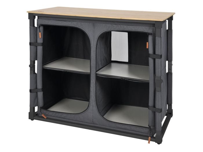 L’Obelink Bamboo Quick - Black dispone di quattro ampi scomparti che ti permettono di riporre la tua attrezzatura da campeggio in modo ordinato e ben organizzato. Sul retro è presente un inserto in rete che garantisce una buona ventilazione interna. La struttura è in alluminio, mentre il piano superiore è in bambù. Il bambù non è resistente al calore diretto: se vuoi cucinare sopra l’armadietto, assicurati che la fonte di calore non tocchi direttamente il piano.