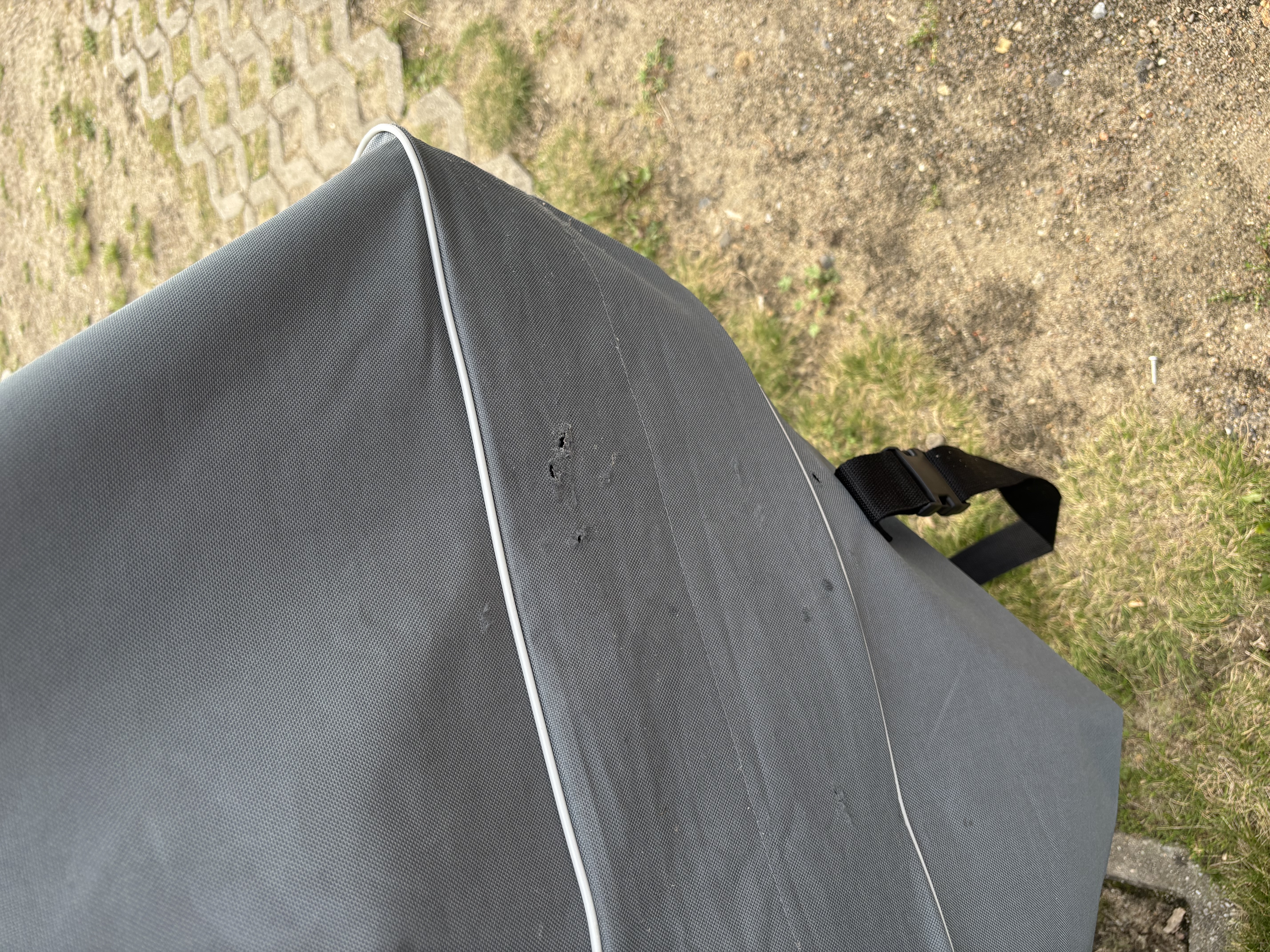 È realizzata in robusto poliestere 600D ed è dotata di chiusura con cerniera, due maniglie e un divisorio interno che evita che le sedie si possano danneggiare sbattendo l'una contro l'altra.