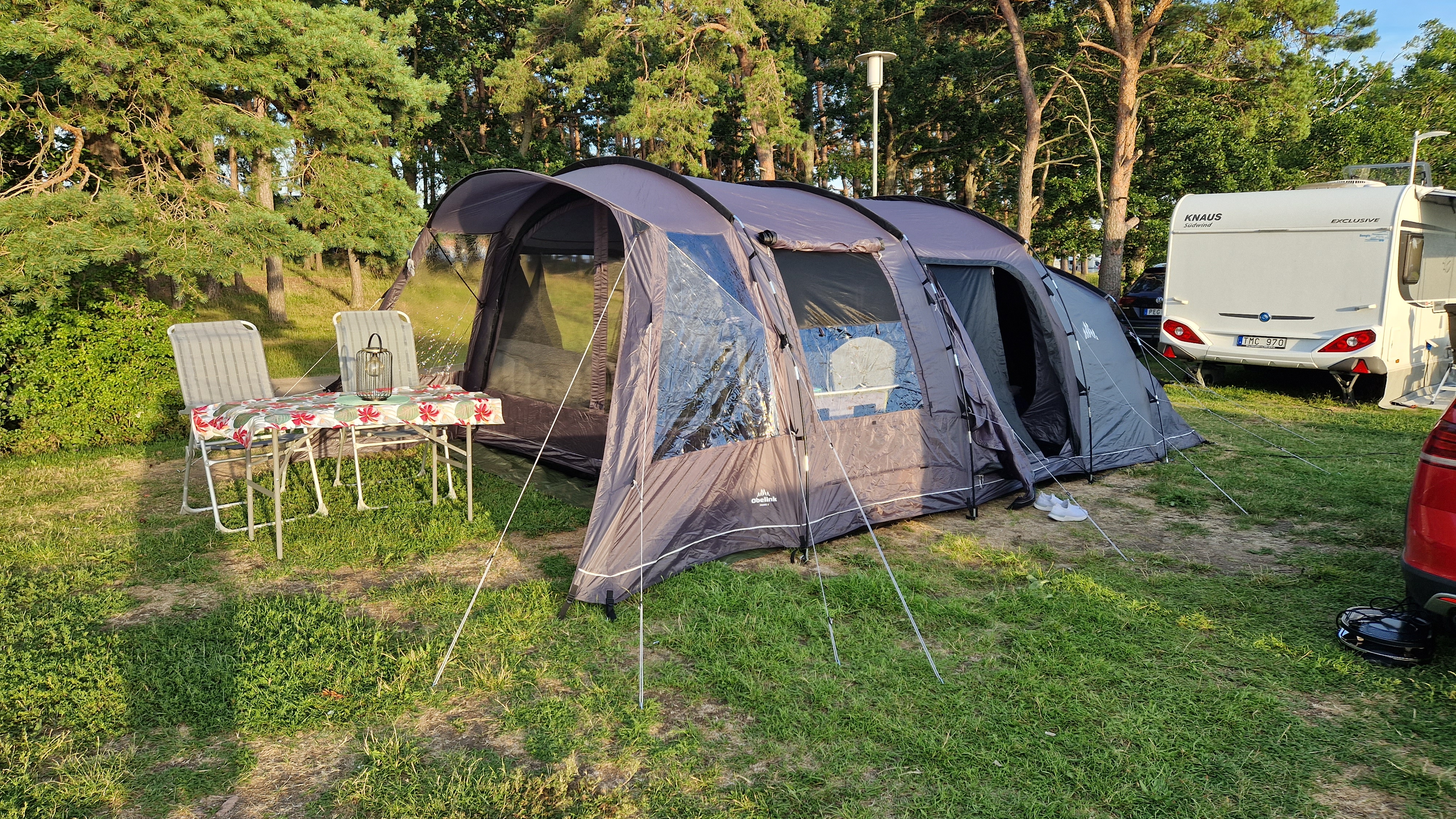 La tenda a tunnel Obelink Primo 6 CoolDark è una spaziosa tenda familiare da 6 posti dotata di cabine letto oscuranti, catino fisso e un ampio tendalino parasole nella parte anteriore.