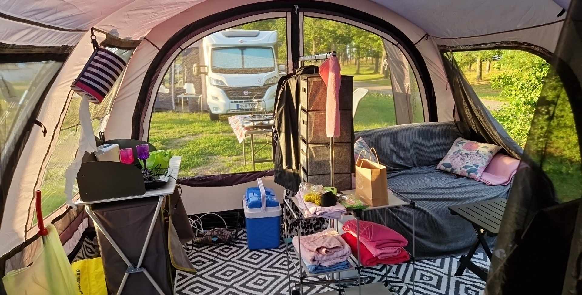 La Primo 6 CoolDark è anche dotata di diversi pratici accessori come, ad esempio, degli scomparti portaoggetti e un gancio per appendere una lampada. Nelle tende in poliestere la ventilazione è molto importante, è per questo che la Primo 6 è dotata di ampie aperture di ventilazione permanenti sotto le finestre laterali e di un'ampia apertura di ventilazione protetta dalla pioggia nella parte posteriore. La parete frontale può essere arrotolata fino a metà sia dal lato destro che dal lato sinistro per creare un ampio ingresso. Entrambi i lati della parete frontale, inoltre, sono dotati di un pannello in zanzariera che può essere coperto dall'interno per mezzo di un oscurante. Anche entrambe le porte laterali sono dotate di zanzariera e il catino fisso con soglia ribaltabile in corrispondenza della porta evita l'ingresso degli insetti e dell’acqua piovana all'interno della tenda.