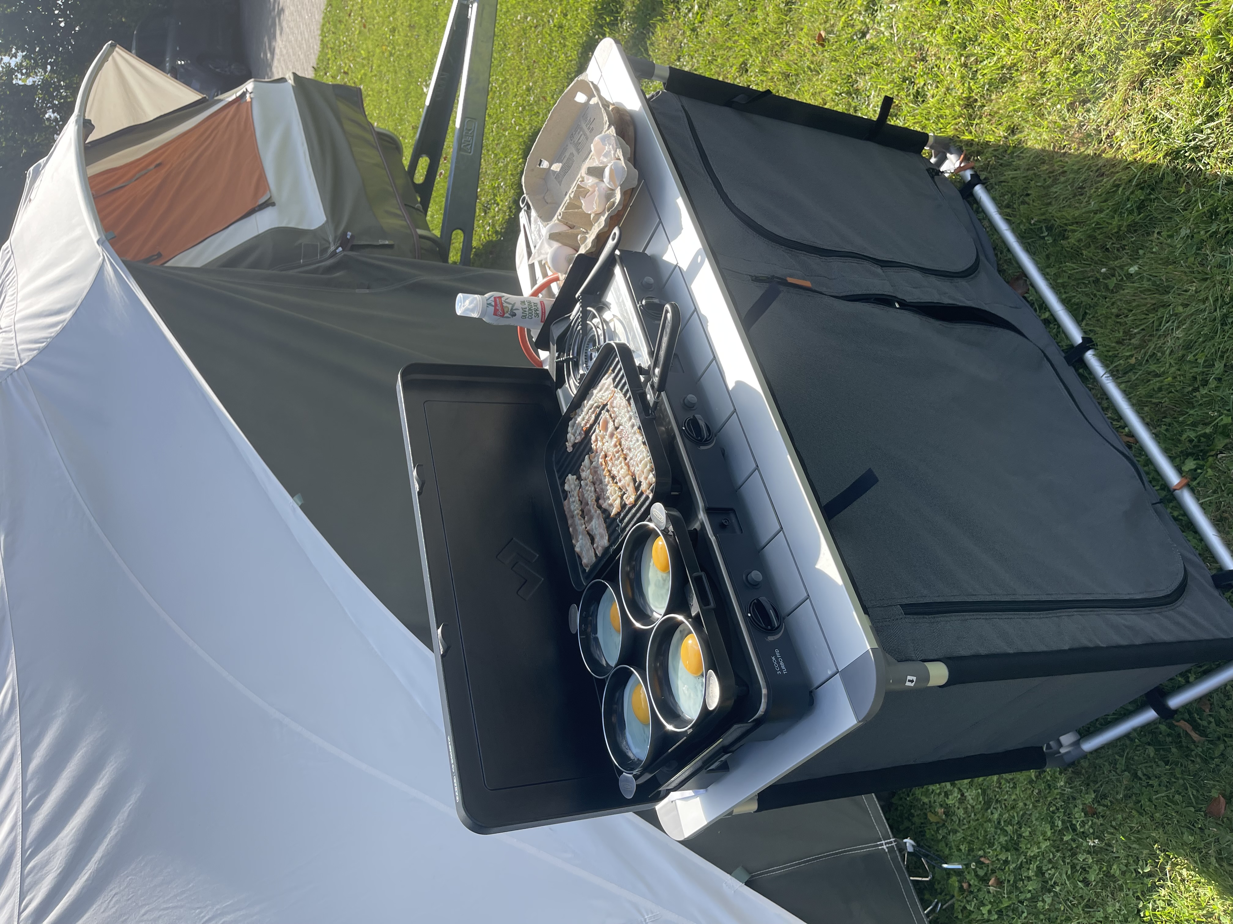 Borsa per il trasporto, Ventilazione permanente nella parte posteriore, Gambe regolabili, Schermo antivento, Spazio per la bombola, Lavandino, Ripiano arrotolabile