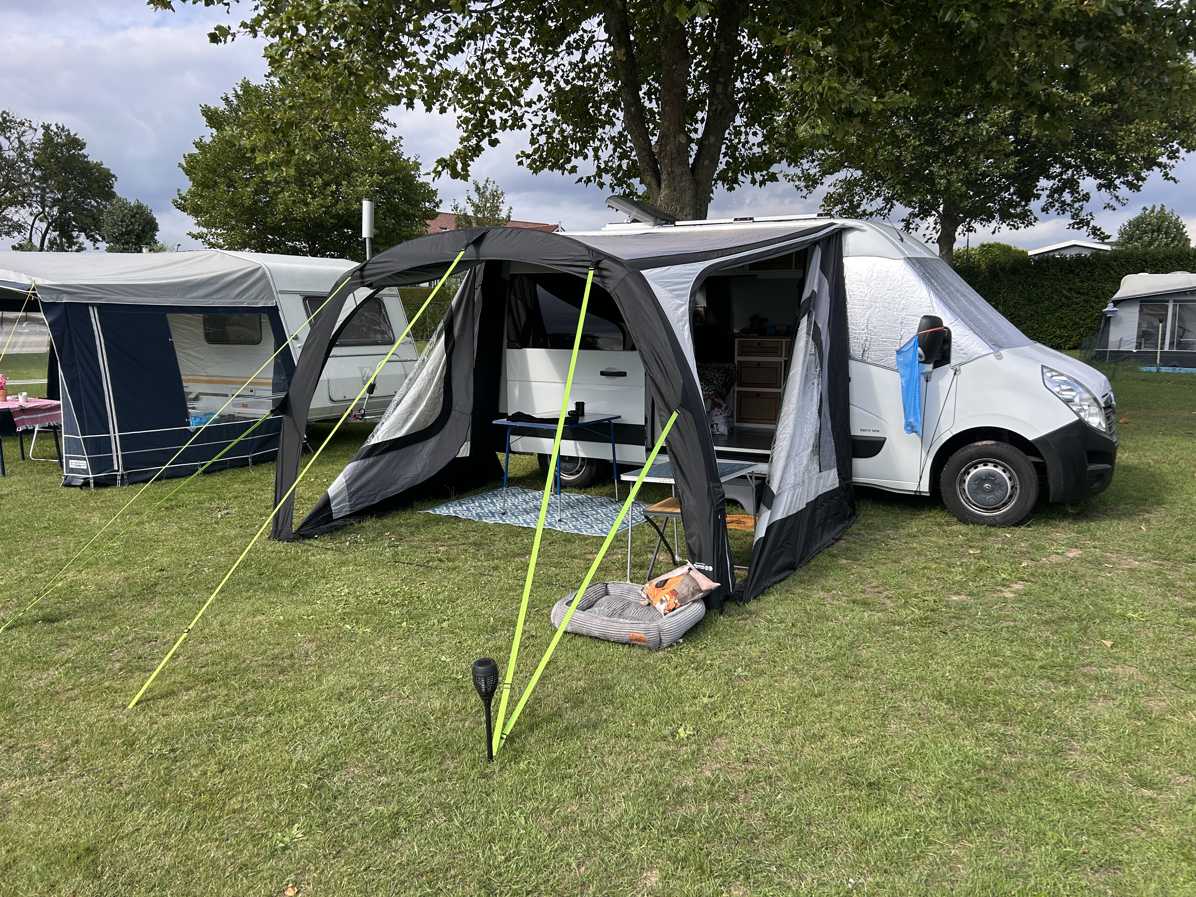 Un tendalino permette di creare una comoda zona ombreggiata davanti alla roulotte. Il tendalino Sunroof ha il tetto realizzato interamente in tessuto per tende Obelink CoolDark, un tessuto extra spesso che non lascia passare minimamente la luce e protegge quindi perfettamente dai raggi UV.