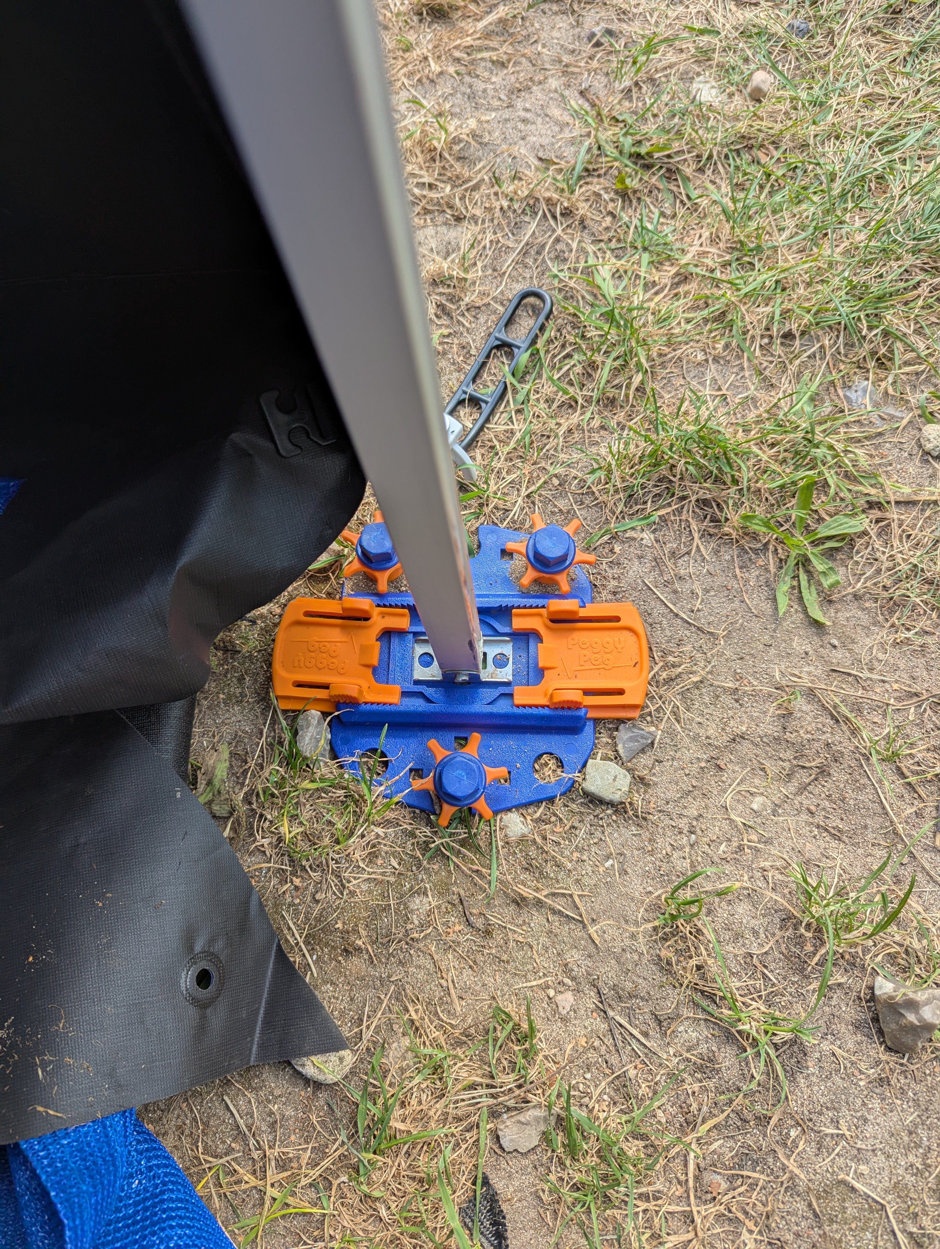 Se non vuoi avvitare i picchetti completamente nel terreno, puoi fissare comunque le piastre di ancoraggio saldamente al terreno per mezzo dei dadi arancioni inclusi nella confezione. La pratica punta per trivella, anch’essa inclusa nella confezione, ti permette di praticare dei fori in cui avvitare i picchetti nel caso in cui il terreno sia troppo duro. Il set è completo di una pratica custodia.