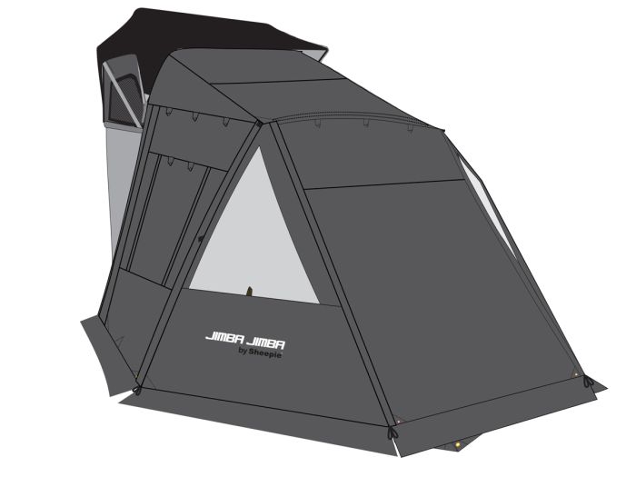La veranda Sheepie, adatta a tutti i modelli di tenda da tetto Jimba Jimba, è una pratica veranda che permette di avere più spazio al coperto quando ci si ferma. In caso di brutto tempo permette di sedersi al riparo dalle intemperie perché offre spazio a sufficienza per un tavolo da campeggio completo di sedie. Quando il tempo è bello si trasforma facilmente in un tendalino parasole semplicemente arrotolando le pareti laterali e quella frontale.