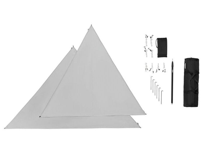 I pannelli triangolari si fissano facilmente mediante il profilo di scorrimento alla parte anteriore del tendalino e si collegano tra loro tramite delle cerniere lampo. Le pareti possono essere montate come si preferisce. Espandendo il Front Pack con il Thule Subsola Side Pack, un pannello Medium o un palo di supporto aggiuntivo, hai ancora più possibilità di configurare ed estendere il Subsola.