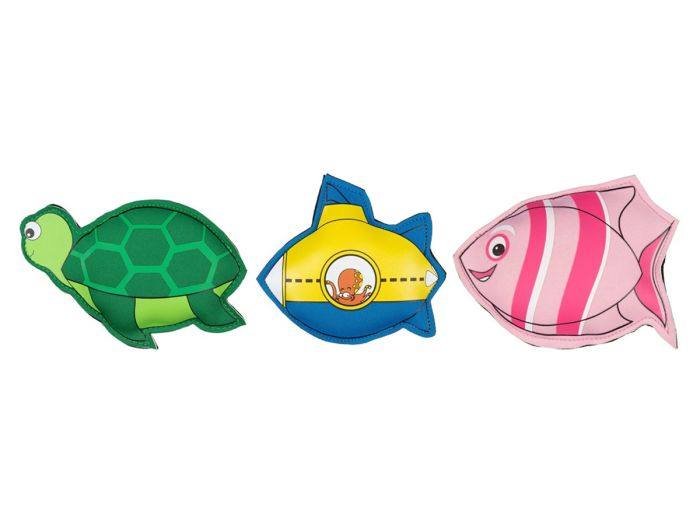 Gli animali sono fatti in neoprene e riempiti di sabbia, in modo che affondino non appena si bagnano. I colori li rendono ben visibili quando si è sott'acqua.