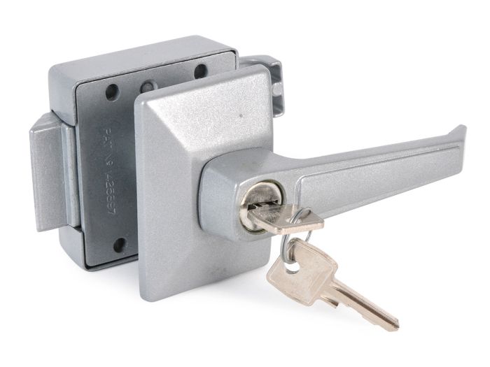 La serratura per porta X-model è una serratura completa in metallo adatta alla porta del caravan o camper. Viene fornita completa di cilindro, 2 chiavi e materiale di fissaggio.